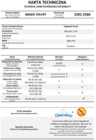 Tkanina MAGIC VELVET, typu welur. Przyjemna w dotyku. Tkanina wyprodukowana w technologii CLEANABOO ograniczającej wchłanianie cieczy W przypadku rozlanej cieczy, jej krople gromadzą się na powierzchni tkaniny. Zabrudzone miejsce wystarczy przetrzeć ściereczką, a najtrudniejsza do usunięcia plama zniknie bez śladu. Czyszczenie przy użyciu łagodnych środków do pielęgnacji tapicerki. Kolekcja MAGIC VELVET charakteryzuje się właściwościami trudnopalnymi. Gramatura: 300 g/m².